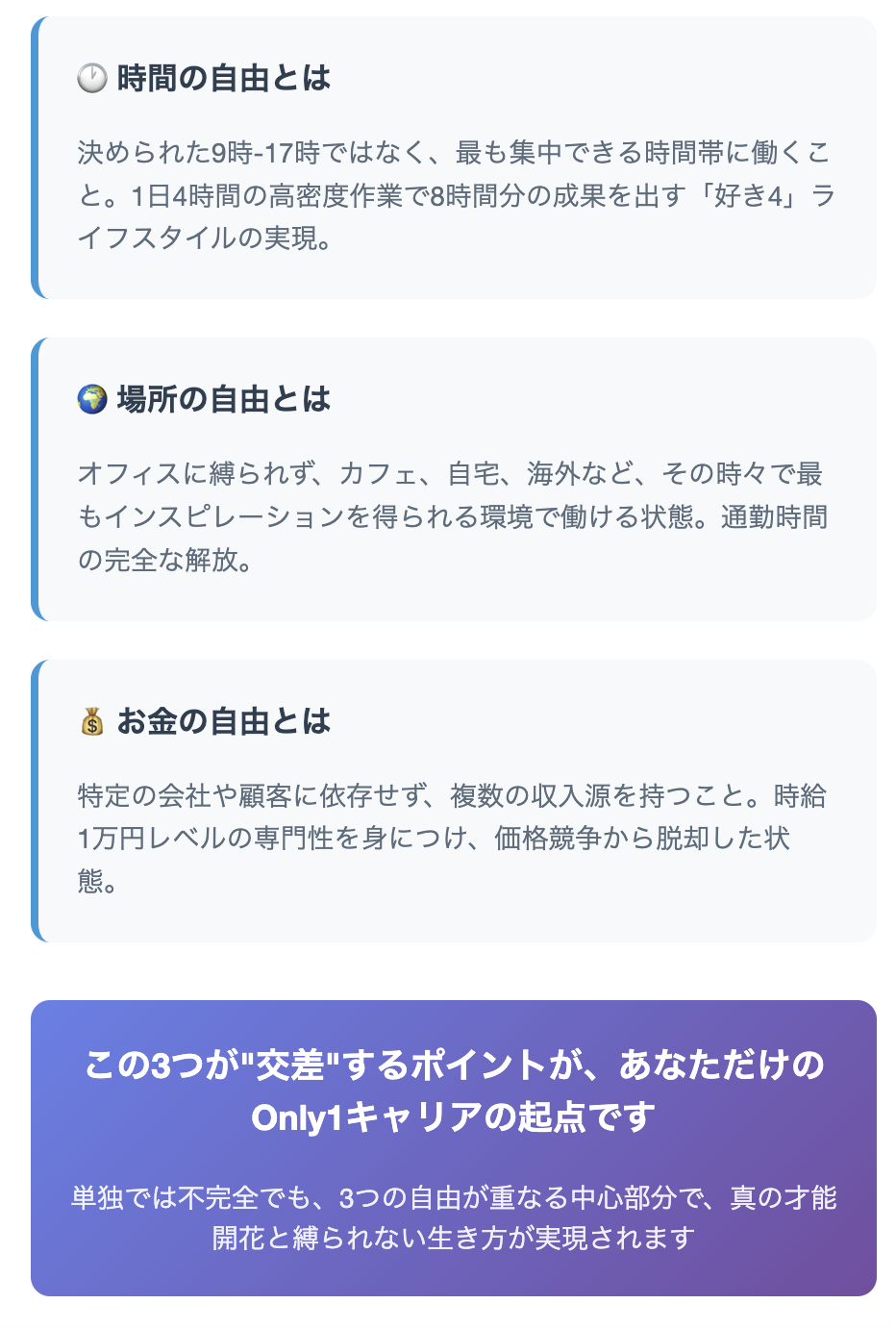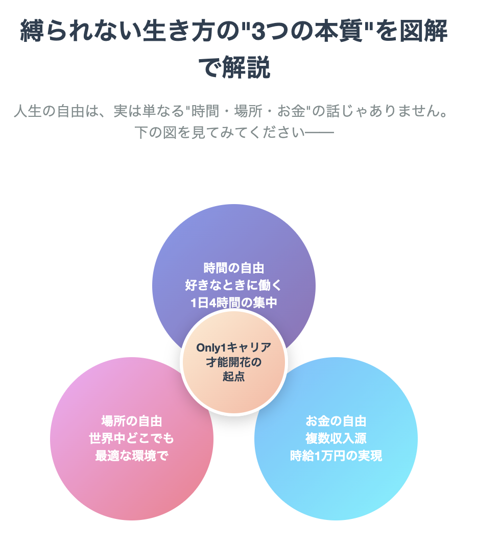 – お金の縛りからの解放:収入源を複数持ち、特定の会社や顧客に依存しない状態へ